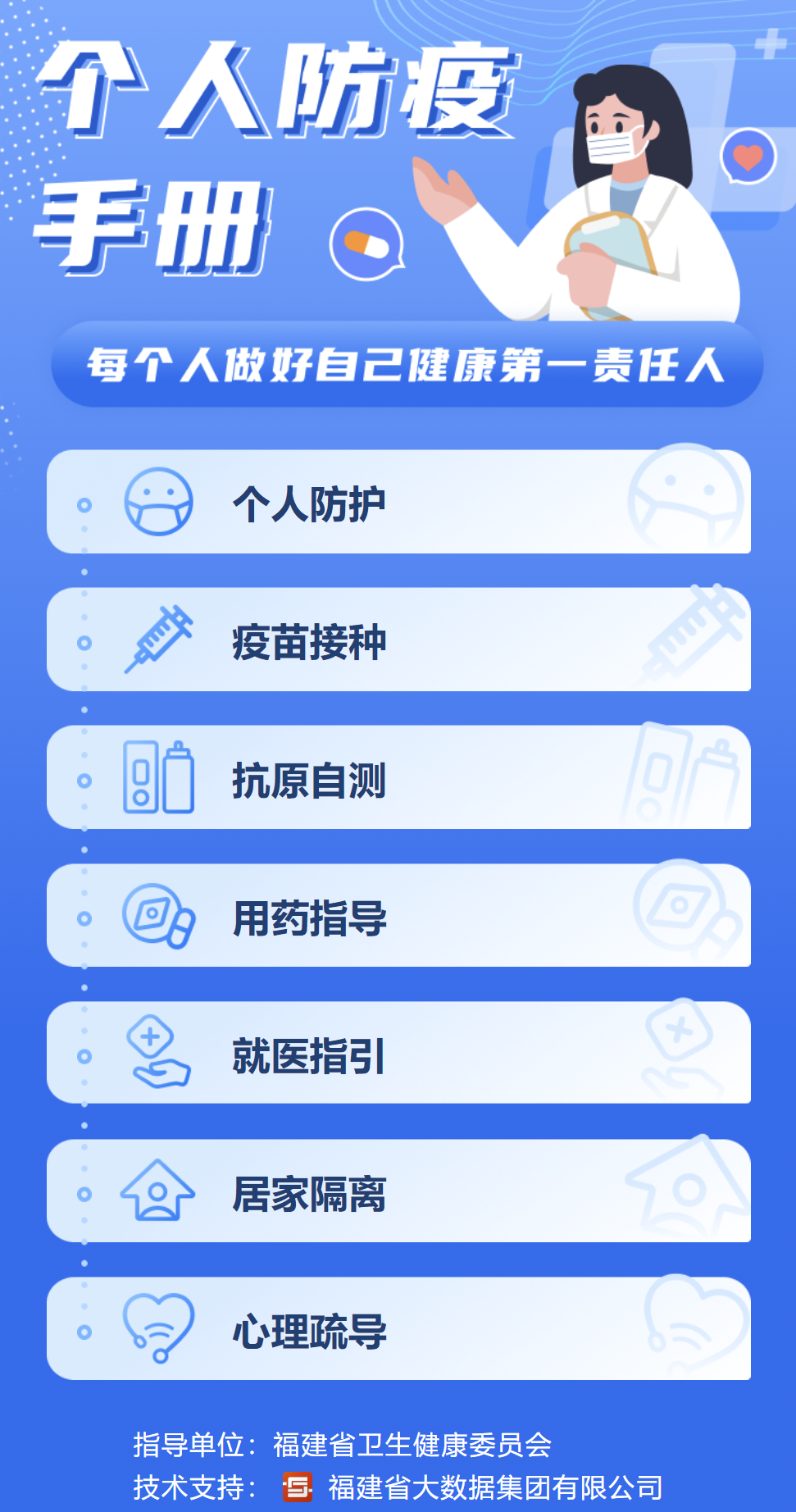 根据疫情防控形势变化和群众关心问题,福建省卫健委推出《个人防疫手册》,设有个人防护、疫苗接种、抗原自测、用药指导、就医指引、居家隔离和心理疏导等七部分内容,供大家参考使用。