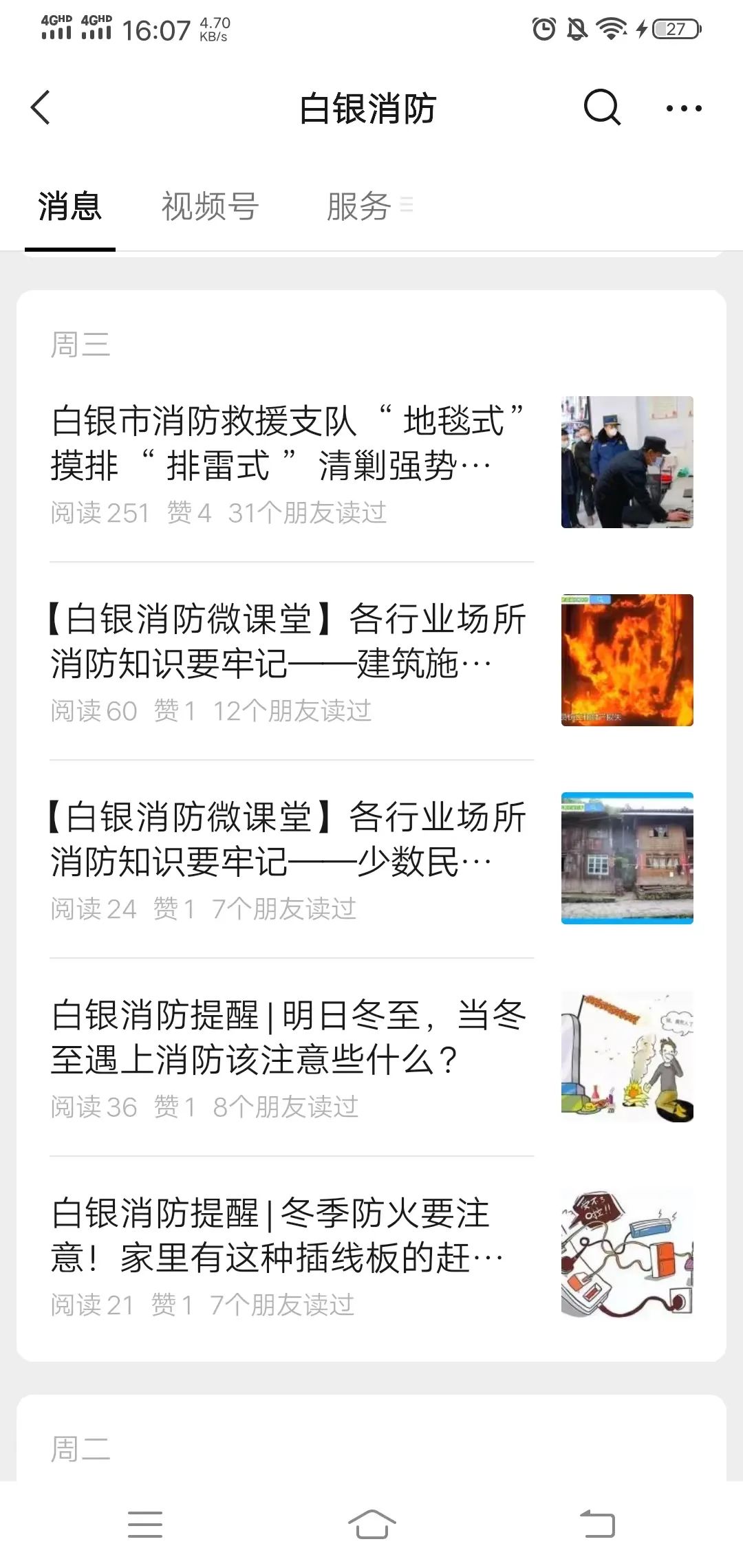 利用新媒体传播快、影响深、效率高的特点,广泛开展消防安全提示工作,大力普及消防安全常识,通过白银消防官方微信公众号、微博、抖音等平台,每天推送消防安全知识,电视台滚动播出消防公益宣传片。充分结合户外LED点多面广、时效性高、方便快捷的优势,协调辖区有LED、户外大屏的单位,每天滚动播出消防安全知识、温馨提示及消防公益广告等内容,同时充分利用出租车、公交车LED显示屏多线路进行巡回宣传,在社区醒目位置张贴宣传海报,做到提示有画面、网络有声音,让消防安全知识宣传深入人民群众的脑海里,时刻提醒人们关注消防安全,增强做好消防安全的自觉性。