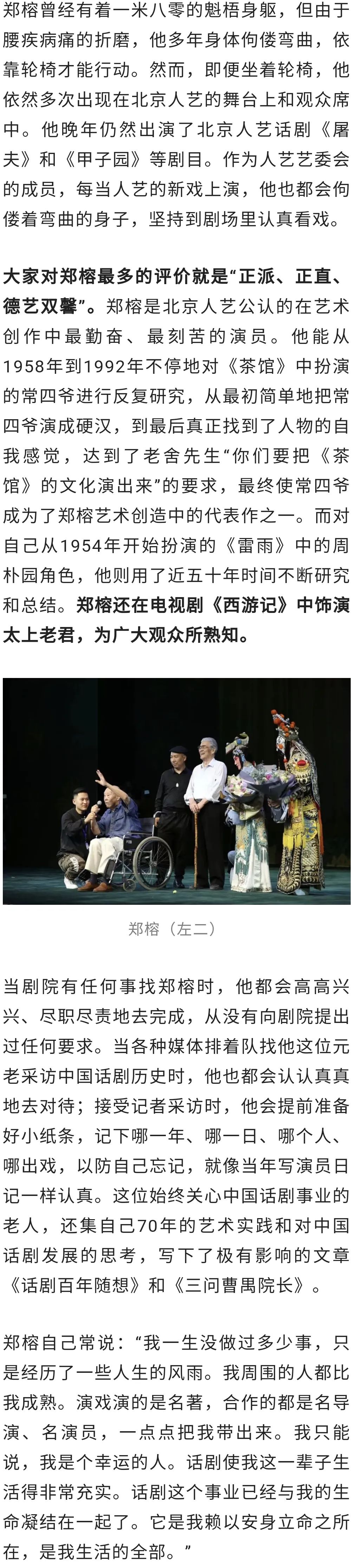 12月24日,北京人民艺术剧院发布讣告:著名表演艺术家、北京人艺艺委会顾问、退休干部郑榕同志,于2022年12月24日8时50分病逝,享年98岁。根据郑榕同志家人意愿,丧事一切从简。