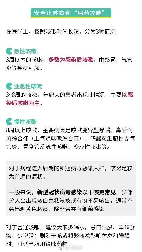 据人民日报微博,航空总医院呼吸与危重症医学科主任医师窦志芳、首都医科大学附属北京朝阳医院副主任医师伍燕兵对咳嗽的不同情况进行了科普,并给出了安全止咳攻略: