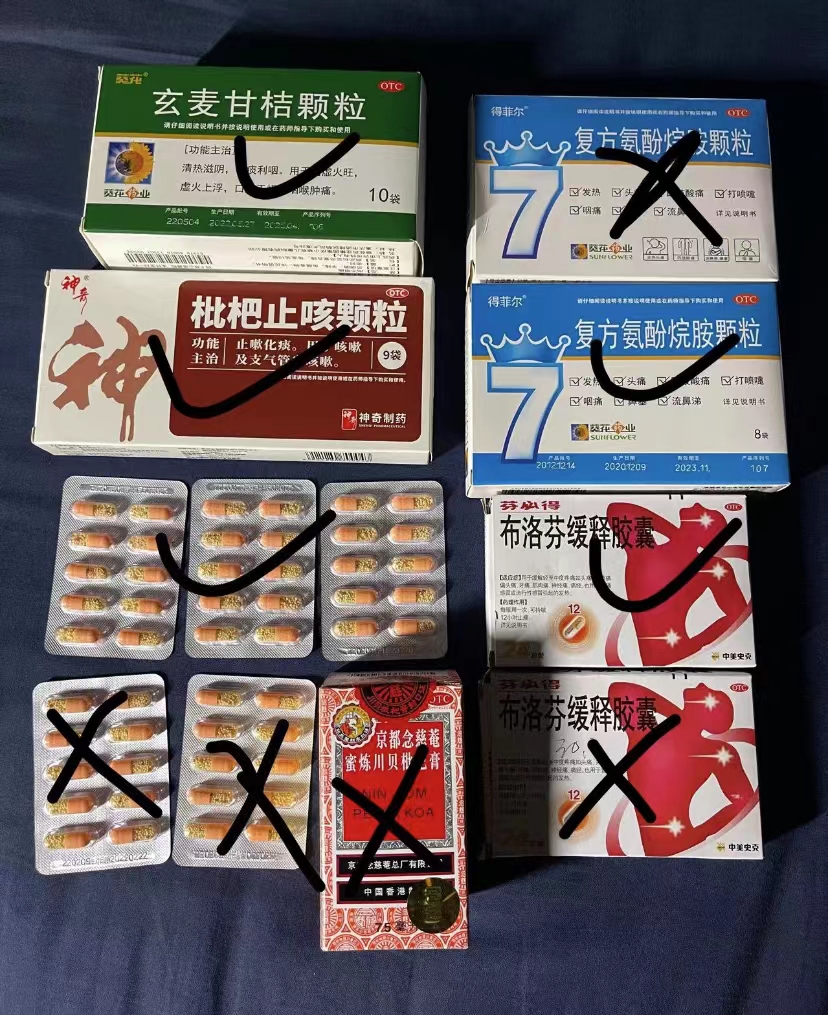 这些药我自己备着,也给亲戚们分了点。后来,我小区有邻居有了症状,我给邻居也拿了些药。目前我手上还有2盒布洛芬以及一些其他的药。
