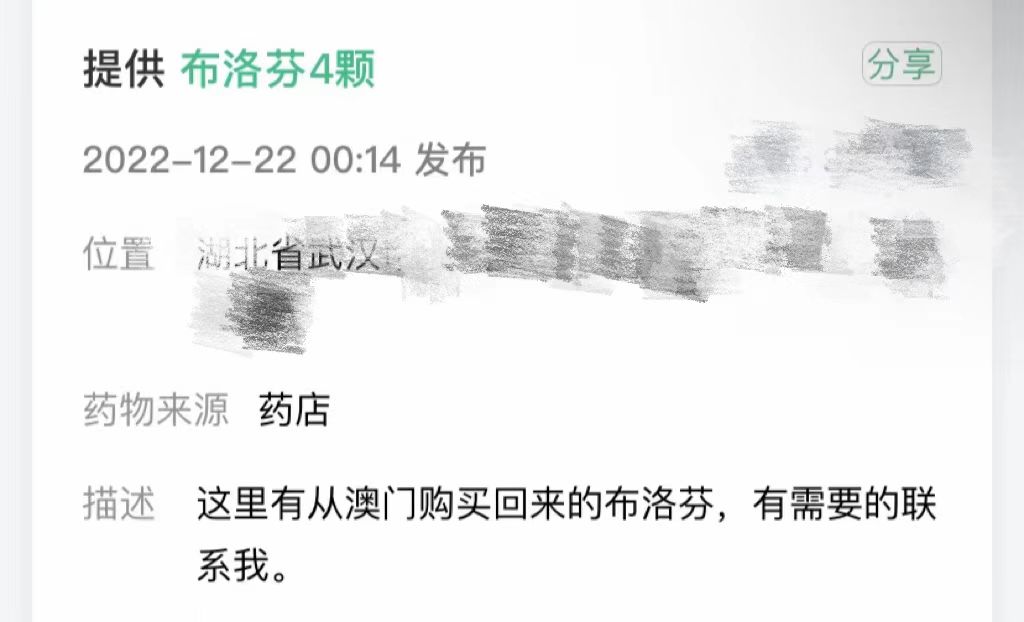 我是12月22日早上在小程序里发布的帮助信息。当时我发布的内容是“武汉市汉阳区益丰大药房新华家园店和它附近的益丰都有公司分配的布洛芬,用于给紧急需要退烧药的人急用,可以到店询问,备药的人就算了,药留给需要的人。”