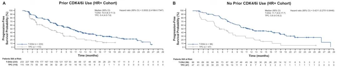 主要终点方面,经盲态独立中心审查(BICR)评估,HR阳性患者中T-DXd组的中位PFS为10.1个月,显著长于化疗组的5.4个月,疾病进展或死亡风险降低49%(HR=0.51;95% CI:0.40-0.64;p<0.001)。