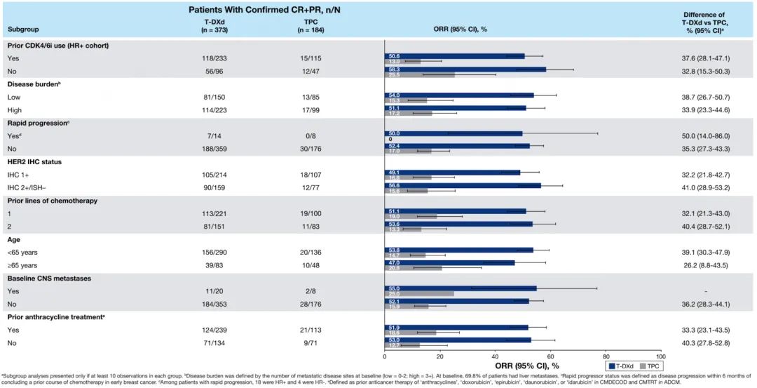 结果还显示,在HR阳性队列中,T-DXd组的ORR为52.6%,是化疗组16.3%的三倍之多,并且T-DXd组有12例(3.6%)患者达到完全缓解(CR),疾病控制率(DCR)为88%,中位缓解持续时间(DOR)为10.7个月。在总体人群中,ORR为52.3%,DCR为87.1%,中位DOR为10.7个月,与HR阳队列结果类似。