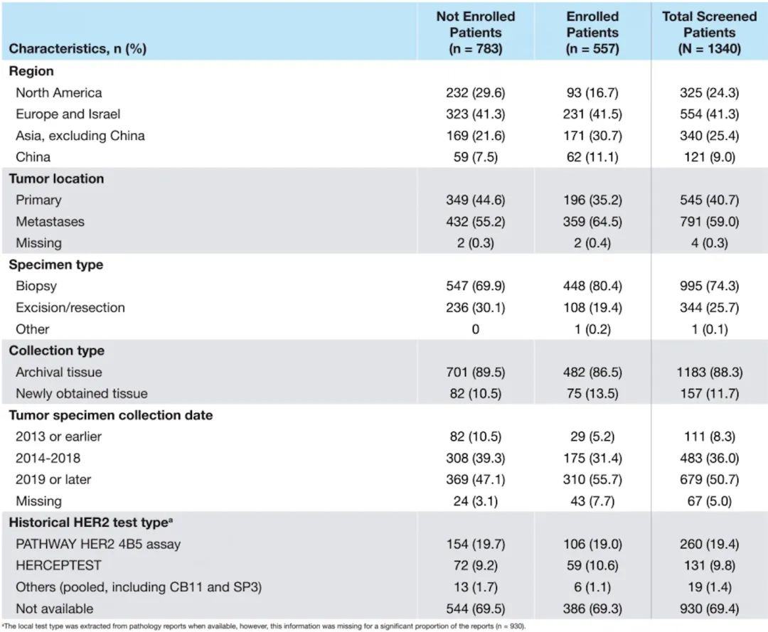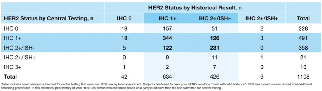 在提交肿瘤样本的1340例患者中,1108份样本同时具有既往(当地)和本次中心实验室 HER2 IHC检测结果;其中1060份样本根据既往(当地)检测结果被判读为HER2低表达(lHC 1+或IHC 2+/lSH-)。并且在这1060份样本中237例经中心实验室确认为非HER2低表达样本(IHC3+,IHC2+/ISH+,IHC 0)。