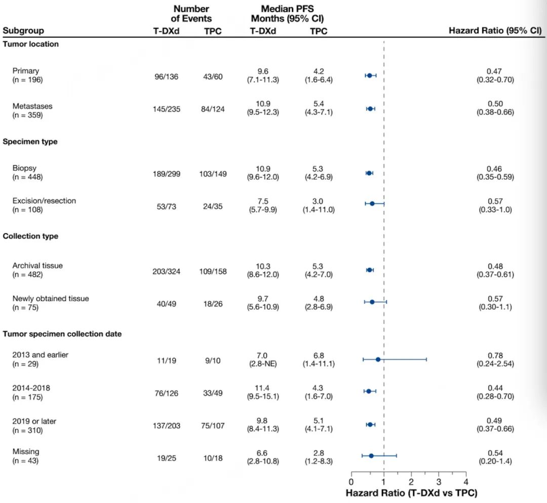 DB04研究中,使用不同样本判读为HER2低表达状态的肿瘤患者,接受T-DXd治疗的疗效获益类似。即原发灶/转移灶、穿刺样本/手术样本、存档样本/新鲜样本、2014-2018/2019(2013年或之前样本,不能很好指导治疗获益)这些不同亚组样本中判读为HER2低表达的肿瘤患者中观察到的T-DXd相比TPC的治疗获益,均与总人群数据一致。
