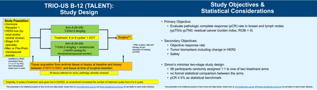 [6].Hurvitz SA, Wang LS, McAndrew NP, et al. TRIO-US B-12 TALENT: Neoadjuvant trastuzumab deruxtecan (T-DXd) with or without anastrozole for HER2-low, HR+ early-stage breast cancer. 2022 SABCS. GS2-03.
