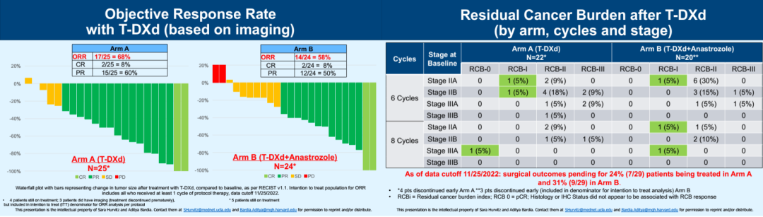 2022年SABCS主要报告该研究第1阶段结果,截至2022年11月25日,T-DXd单药与T-DXd+阿那曲唑相比,客观缓解率:68% vs 58%,其中完全缓解率:8% vs 8%,部分缓解率:60% vs 50%。RCB 0/1级:15% vs 15%。