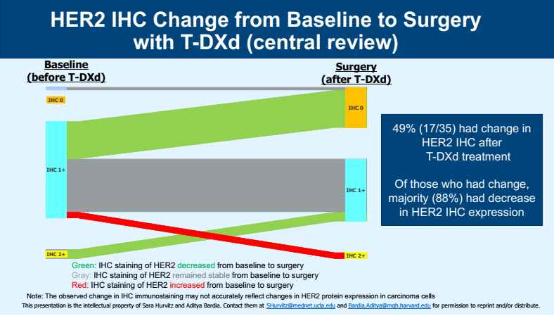 不仅如此,研究还观察到49%的患者在接受T-DXd治疗后肿瘤细胞发生HER2表达状态的改变,其中88%的患者表现为HER2表达减少。新辅助治疗前后HER2状态发生变化在既往研究中均有报道,这也提示乳腺癌HER2表达存在高度异质性,基于这种新辅助治疗前后HER2表达的变化,是否会对以HER2为靶点的T-DXd的治疗产生影响,有待进一步考究。