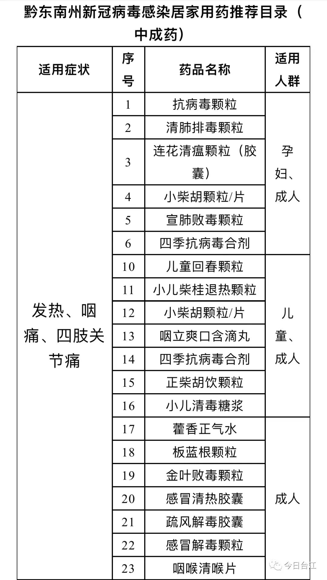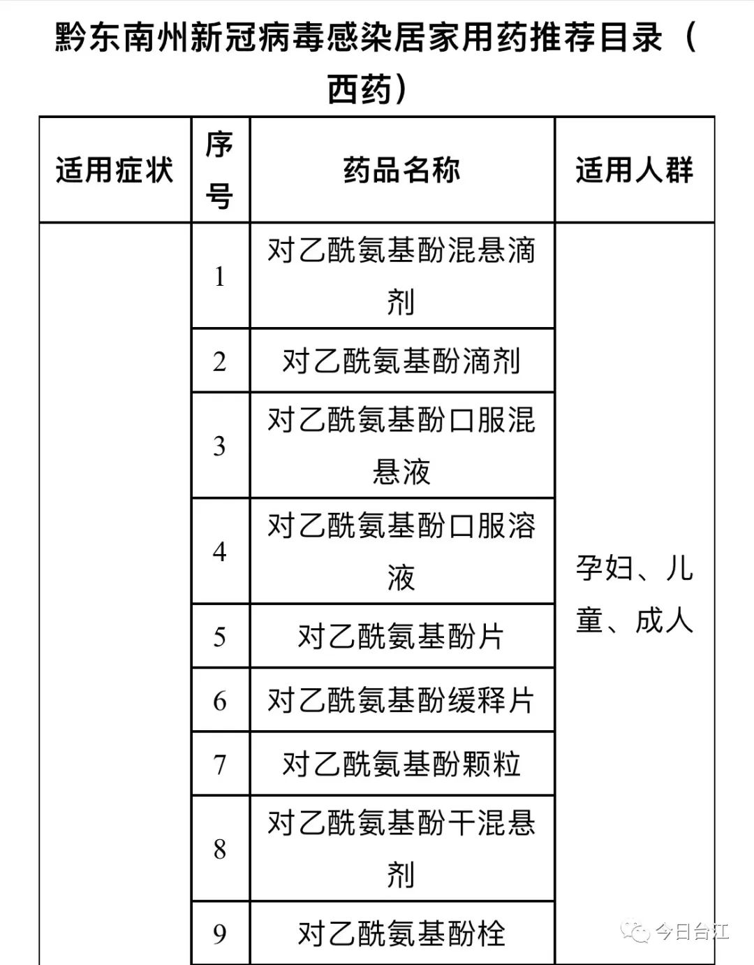 为进一步科学、规范做好新冠病毒肺炎防治工作,加强合理用药指导,黔东南州卫生健康局组织我州药学、临床、中医专家结合本轮疫情用药实际,制定了黔东南州新冠病毒感染居家用药推荐目录,现推荐给广大市民朋友合理参考。