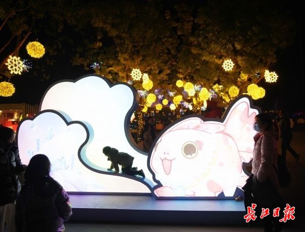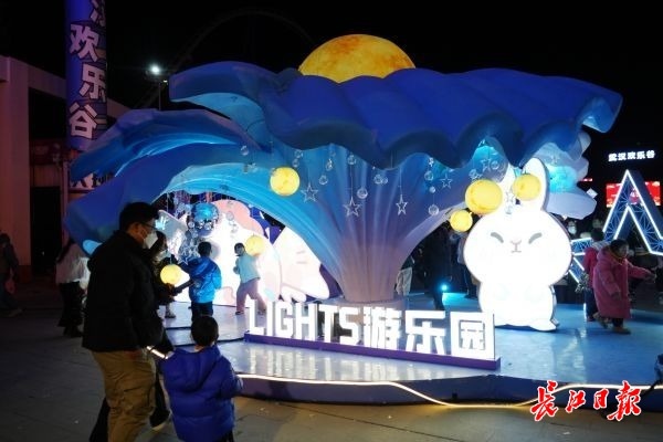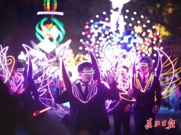 当天,长江日报记者来到武汉欢乐谷,刚一入园便被眼前绚烂的“星河之门”吸引,光落如雨,让人恍惚“疑是银河落九天”。行至趣野营地,鲸鱼、麋鹿、兔子等不同动物形状的灯组在夜幕下闪烁着神秘的光芒,宛如神奇动物的童话王国。