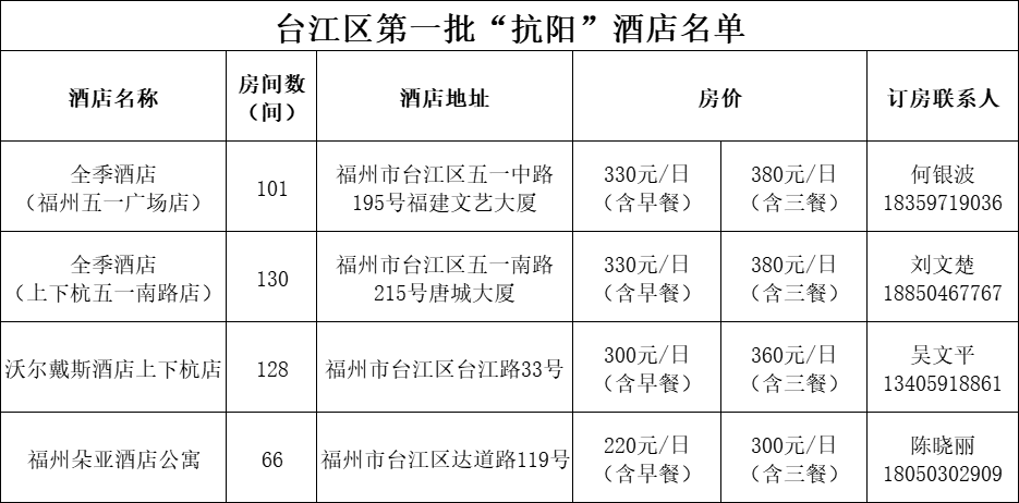 为方便无症状感染者、轻症患者选择合适的“抗阳”酒店,台江区现推出第一批“抗阳”酒店,请您根据自身情况选择酒店和套餐(详见文末表格)。更多的“抗阳”酒店信息后续还将陆续推出,敬请关注。