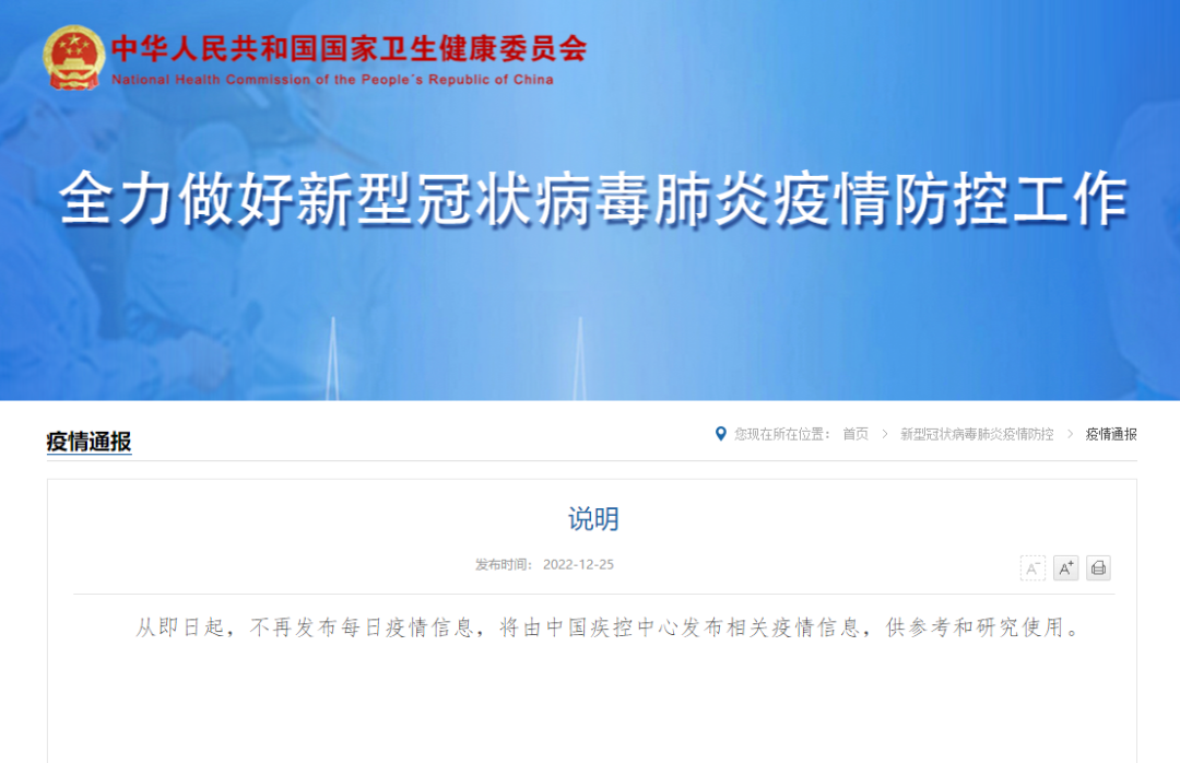 国家卫健委:即日起不再发布每日疫情