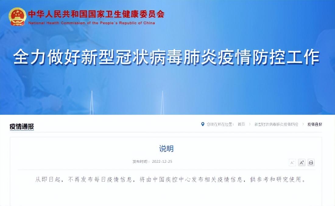 据国家卫健委网站12月25日消息:从即日起,不再发布每日疫情信息,将由中国疾控中心发布相关疫情信息,供参考和研究使用。