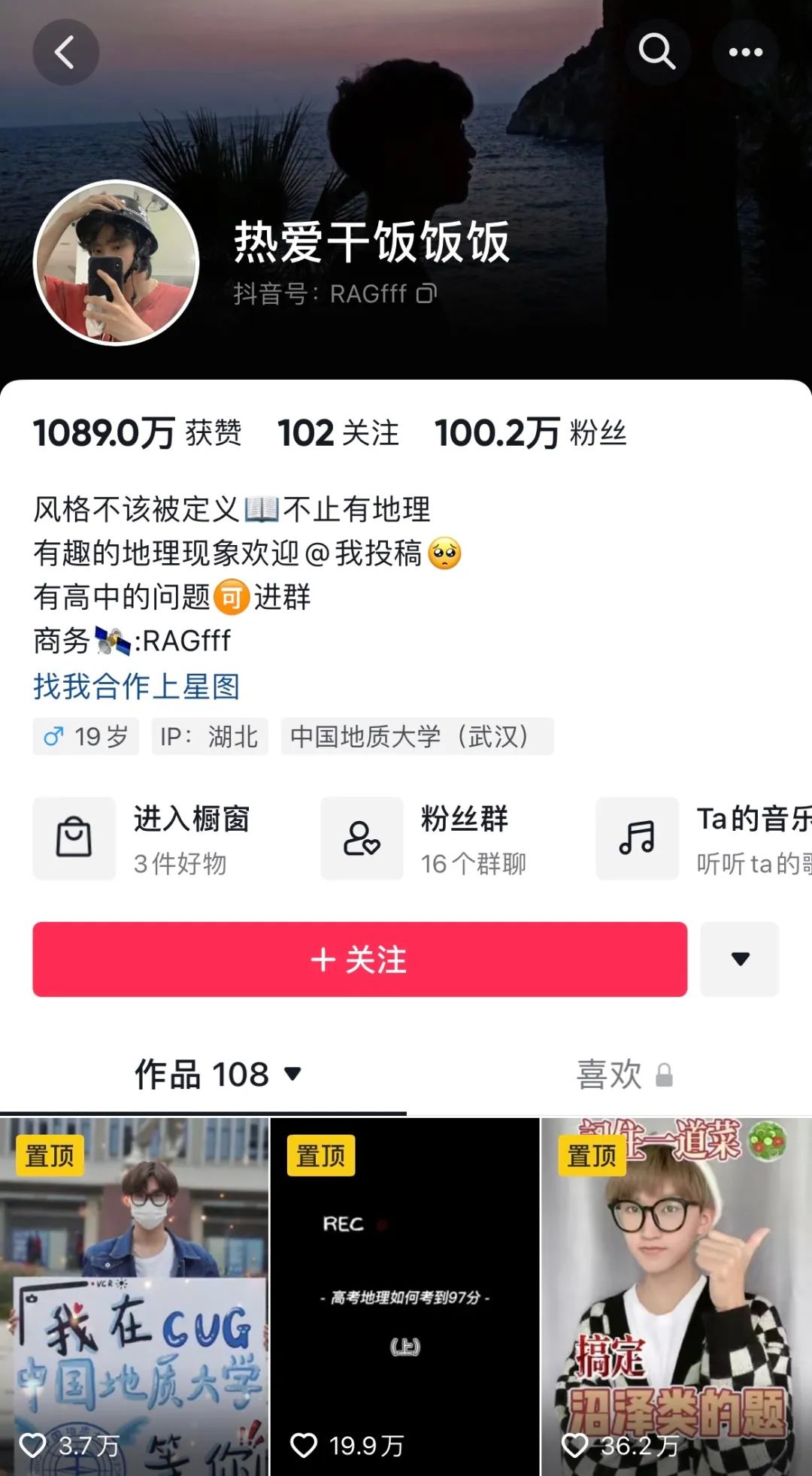 而给出讲解的,是中国地质大学(武汉)的大二学生年跃。今年19岁的他,高考结束后开始在抖音分享自己学习地理的心得,凭借着风趣幽默的科普内容圈粉百万粉丝,累计获得点赞1000万。评论区,不少学弟学妹留言说,因为他的内容,自己也喜欢上了地理,甚至还有地理老师把他的科普视频当做范例,分享给学生们。
