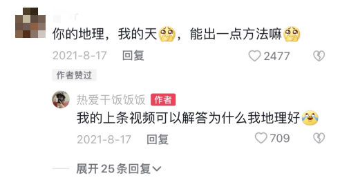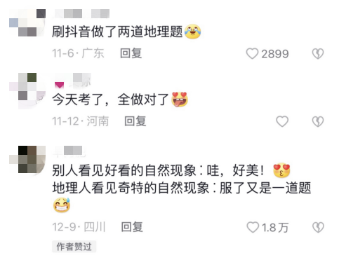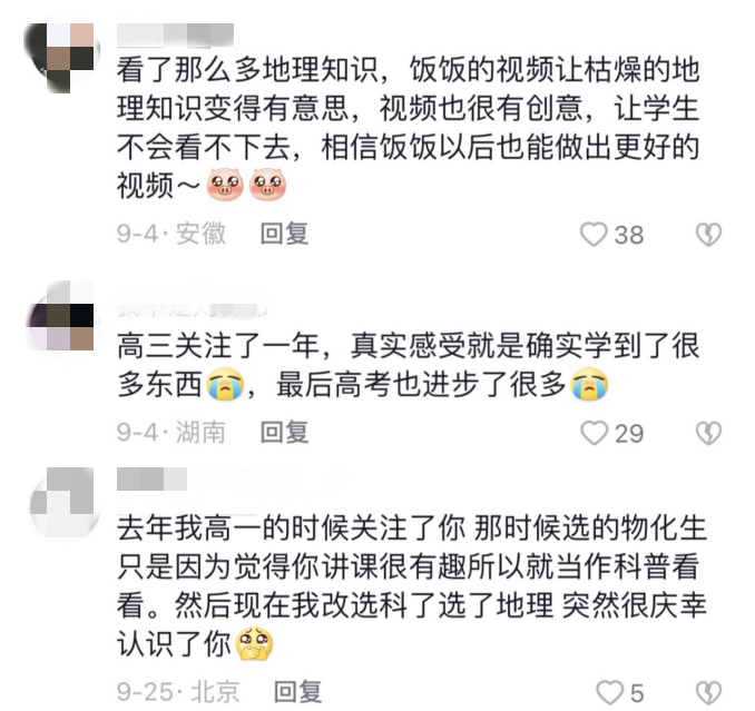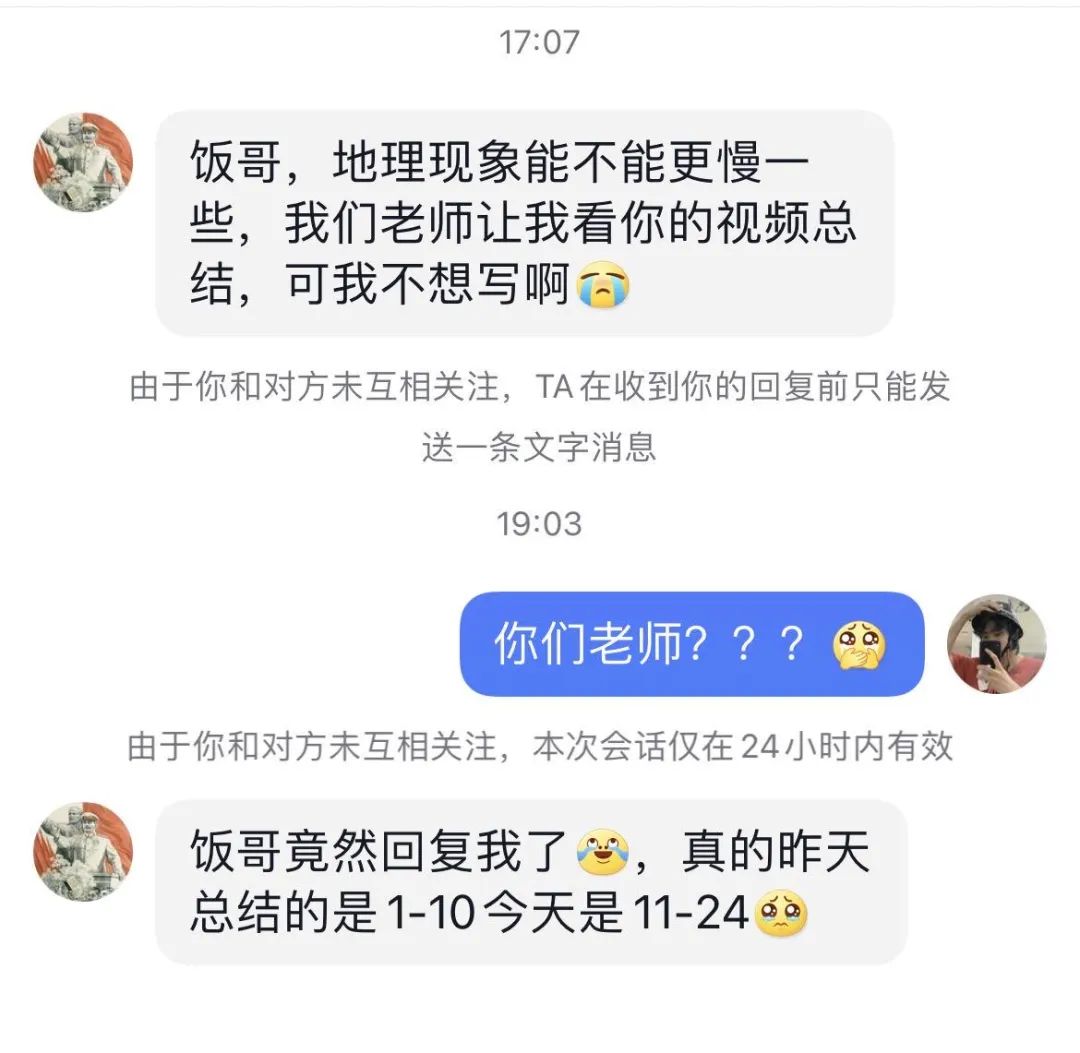 有粉丝留言说,自己平时看课本总是记不住的知识点,被年跃这样幽默地演绎后,印象更深刻了。甚至还有学弟学妹私信年跃,求他更新的稍微慢一点,因为地理老师布置了“看视频做总结”的作业,但自己总结的速度还常常跟不上年跃更新地理现象的速度。