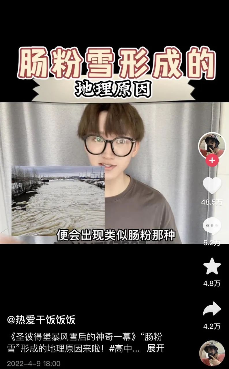 今年4月,有粉丝发来一段“圣彼得堡暴风雪后出现肠粉雪”的视频,请年跃讲讲形成原因。超过500万人次观看了年跃的解答视频,3个月后,有粉丝告诉年跃:肠粉雪相关题目出现在了自己所在城市的市统考试卷上,其中几个选项正是年跃讲过的知识点。这让年跃一下多了几分责任感:“倒是也谈不上押题,但能够让大家在休息时记住有用的知识点,是很荣幸的事。”