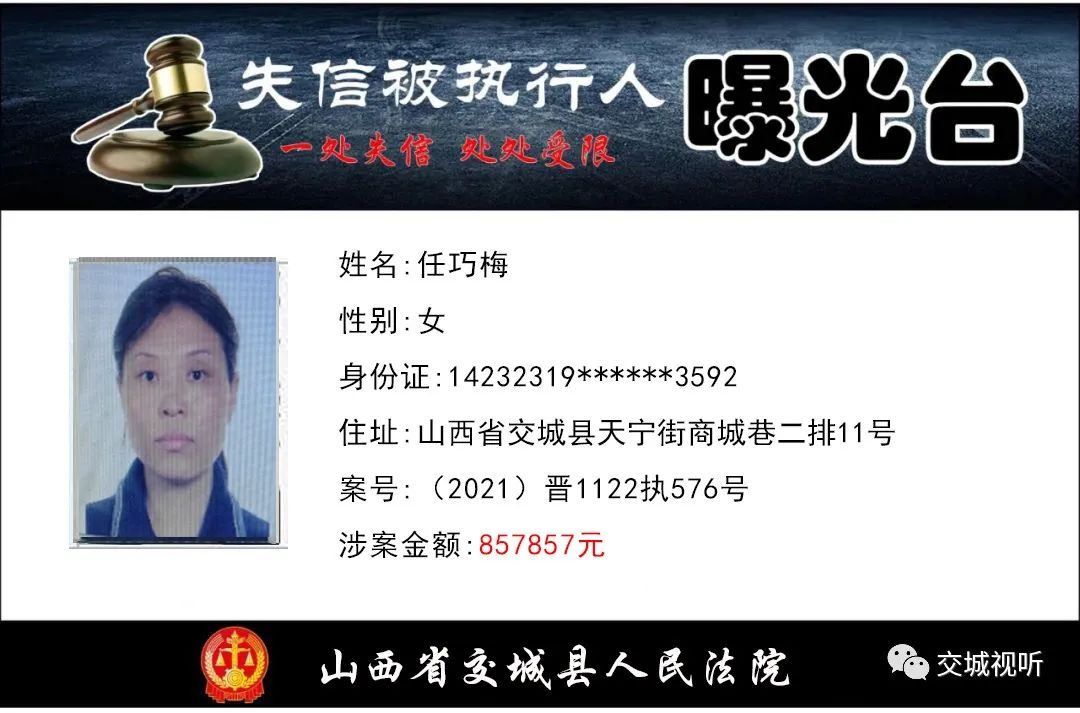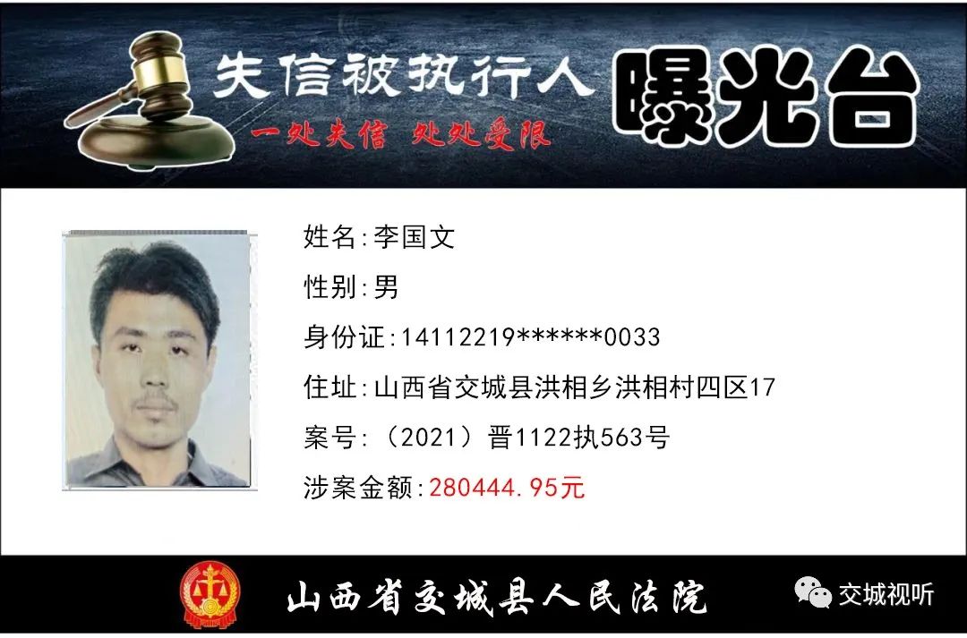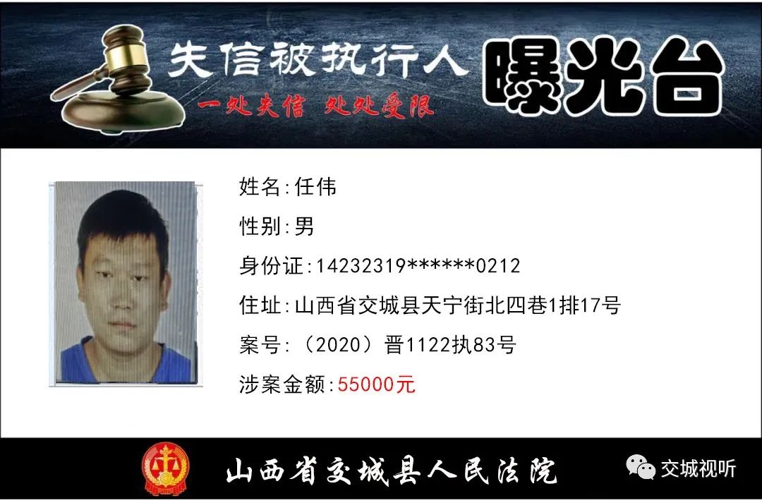 为依法严厉打击规避执行、抗拒执行等行为,根据《中华人民共和国民事诉讼法》第二百六十二条、《最高人民法院关于公布失信被执行人名单信息的若干规定》相关规定,交城县人民法院依法将下列被执行人纳入失信被执行人名单,并向社会曝光。交城县人民法院在此郑重提醒,被执行人拒不履行生效法律文书确定的义务,将依法采取罚款、拘留、限制出境、信用惩戒等强制措施,构成犯罪的,将依法追究刑事责任。