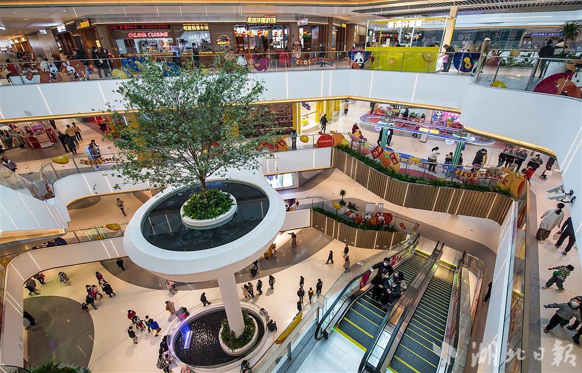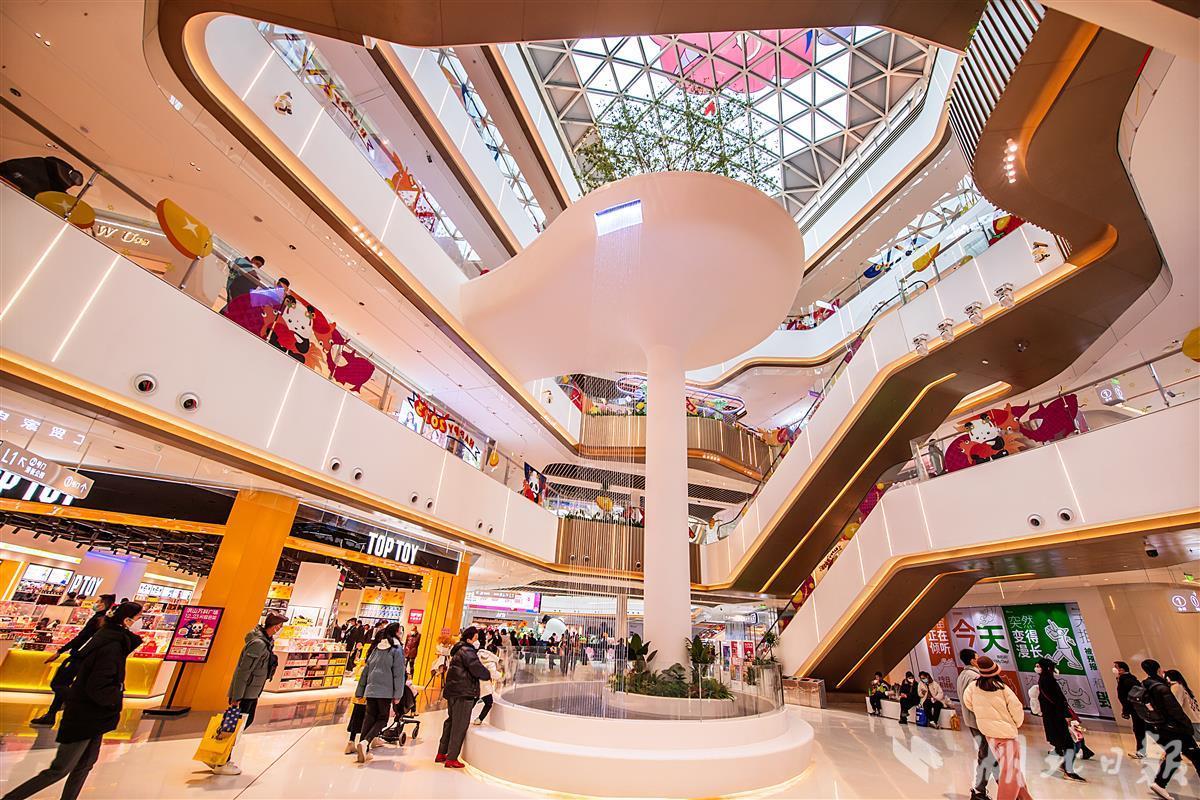 将垂直公园引入商场,打造18米跨层瀑布水幕、浮岛悬空树以及走廊外的各种绿植构成的室内公园。据悉,该广场位于武汉白沙洲,总建筑面积约11万平米,致力于为消费者构建全新的体验中心、生活剧场和消费高地。(湖北日报全媒记者 朱熙勇 摄)