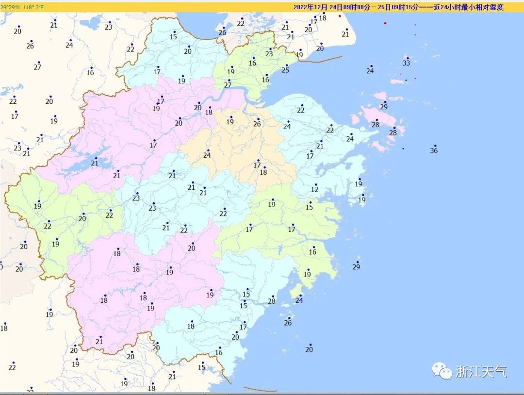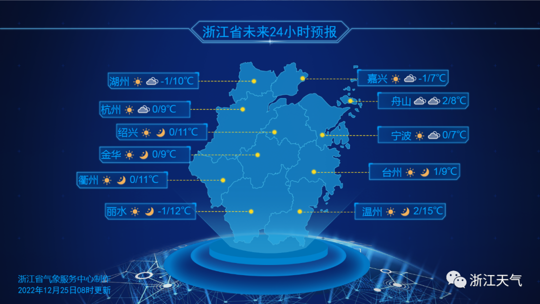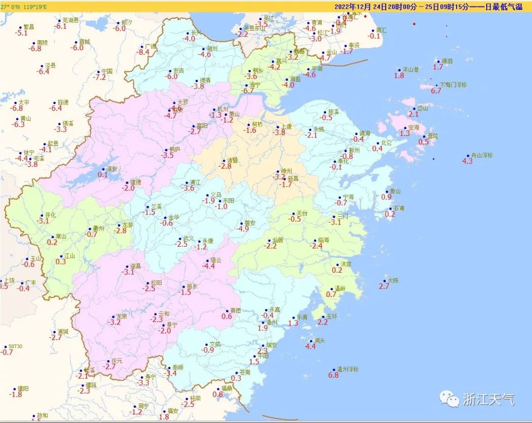 今早最低气温,除沿海地区外全省大部分地区只在-1~-3℃,湖州、嘉兴和杭州西部-3~-6℃,最低海宁只有-6.7℃。