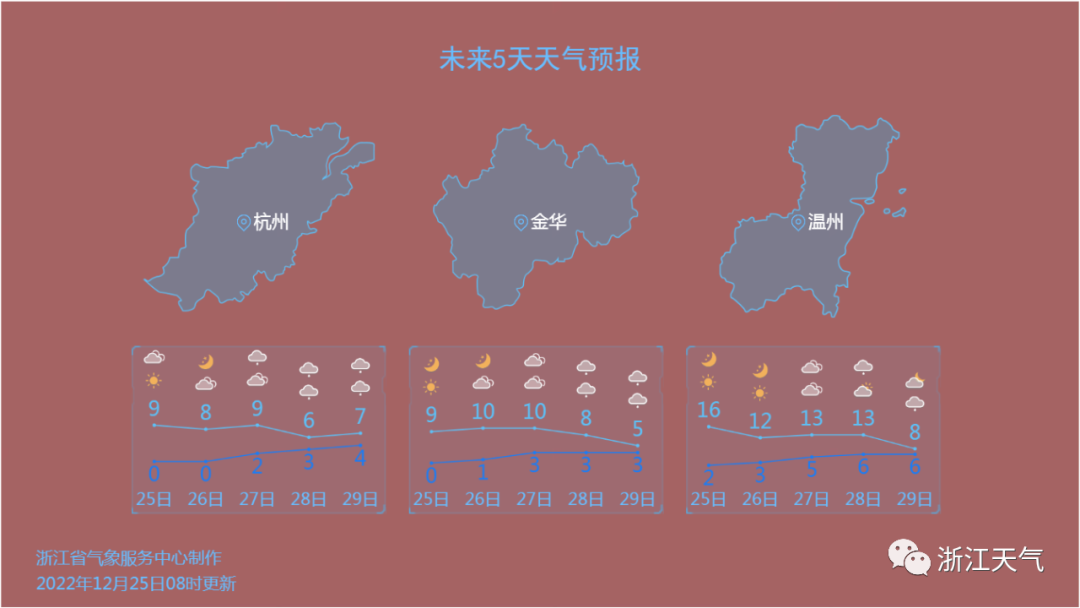 预计今天全省晴到少云,最高温度浙北地区:6-8℃,浙南地区:11-13℃,其它地区:8-10℃。适合晒晒太阳,补补钙!