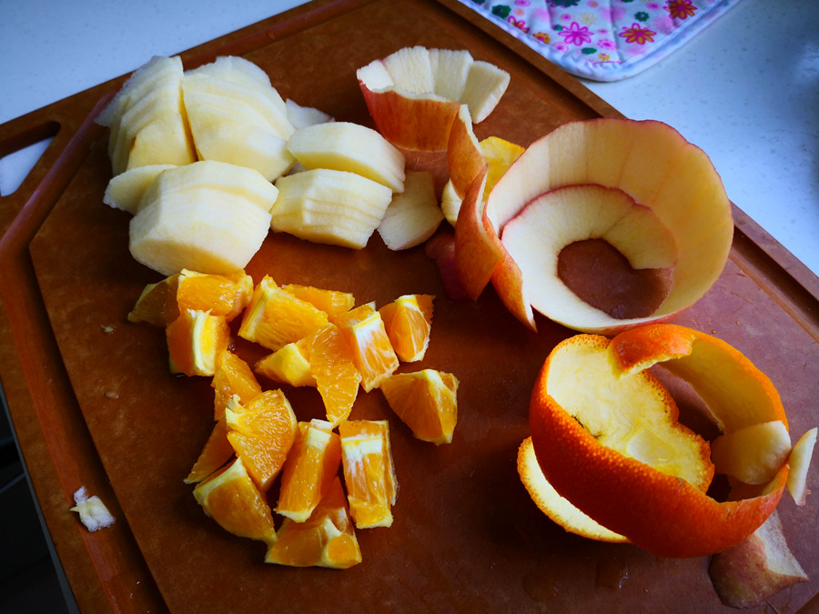 1.取橙子和苹果各一个,先用盐将果皮搓洗几遍,冲洗干净后放在淡盐水中再浸泡8分钟,目的是杀菌去虫卵。随后将橙子和苹果分别削去外皮,再把苹果切成薄片、橙子切小块备用。