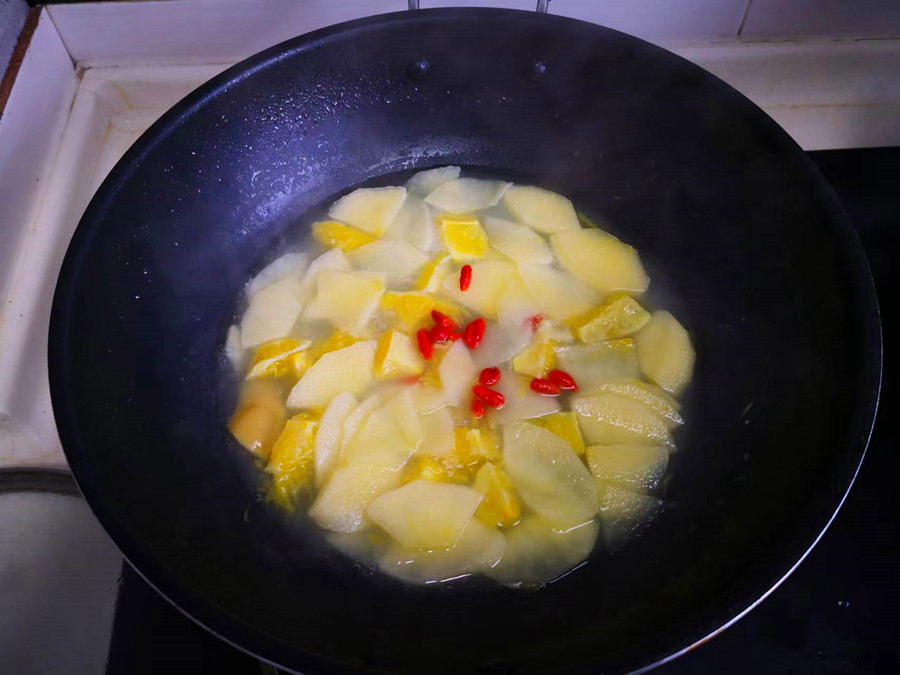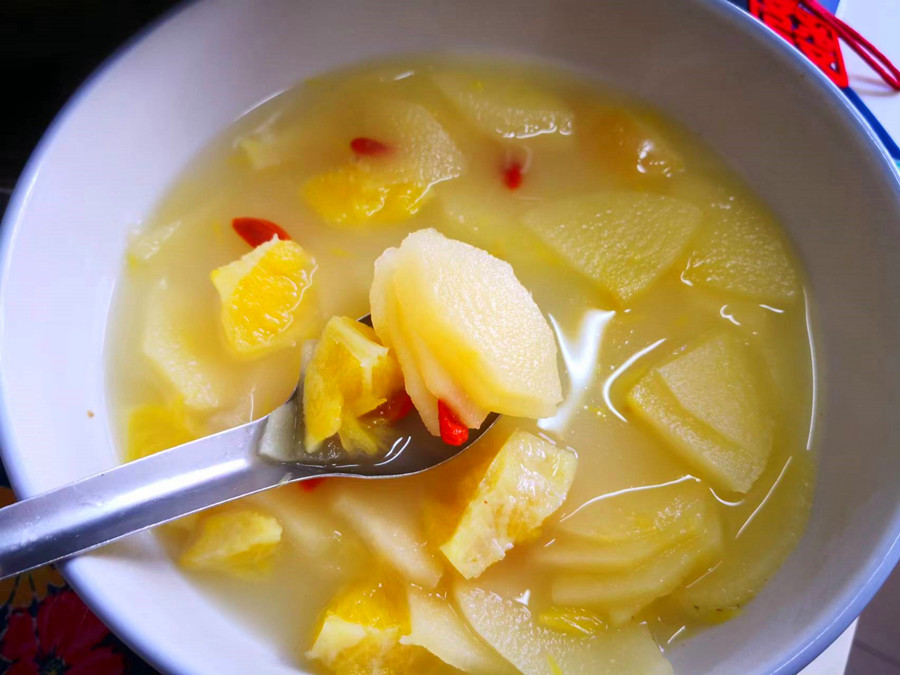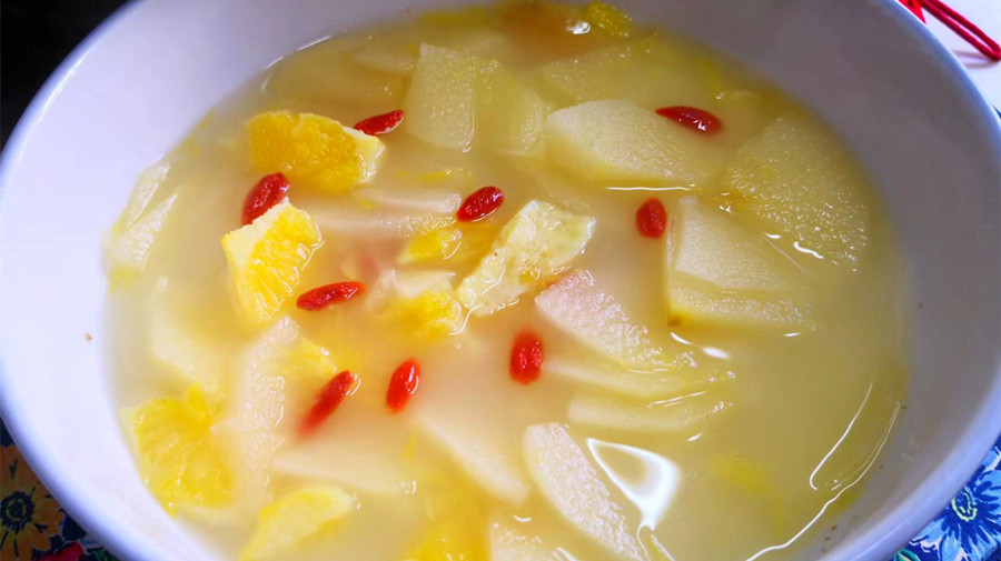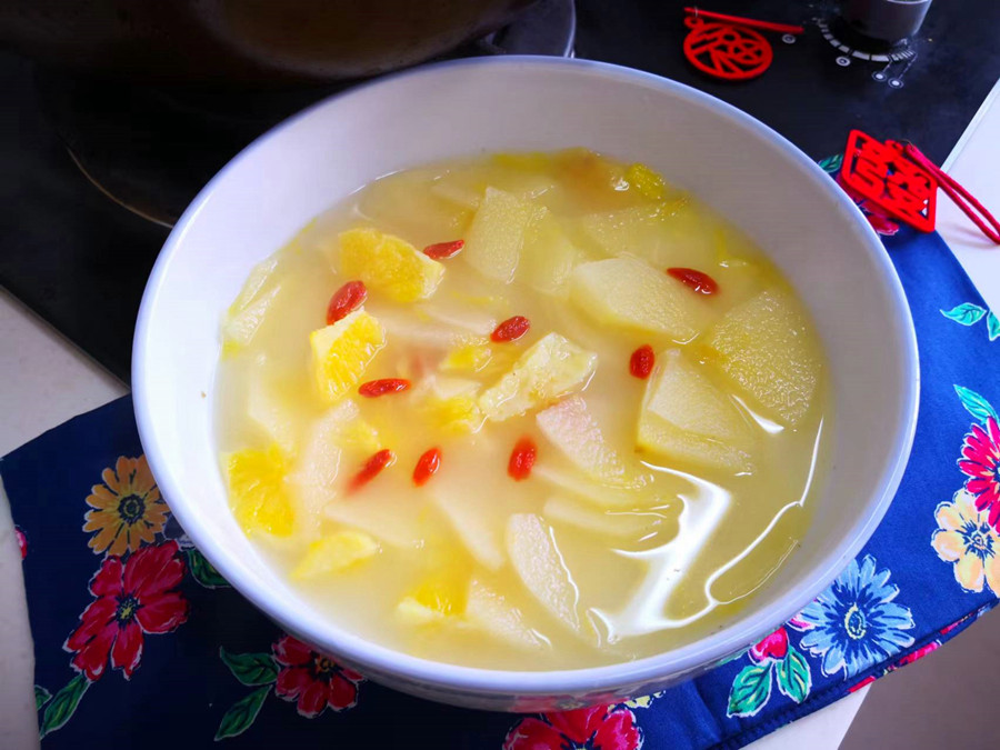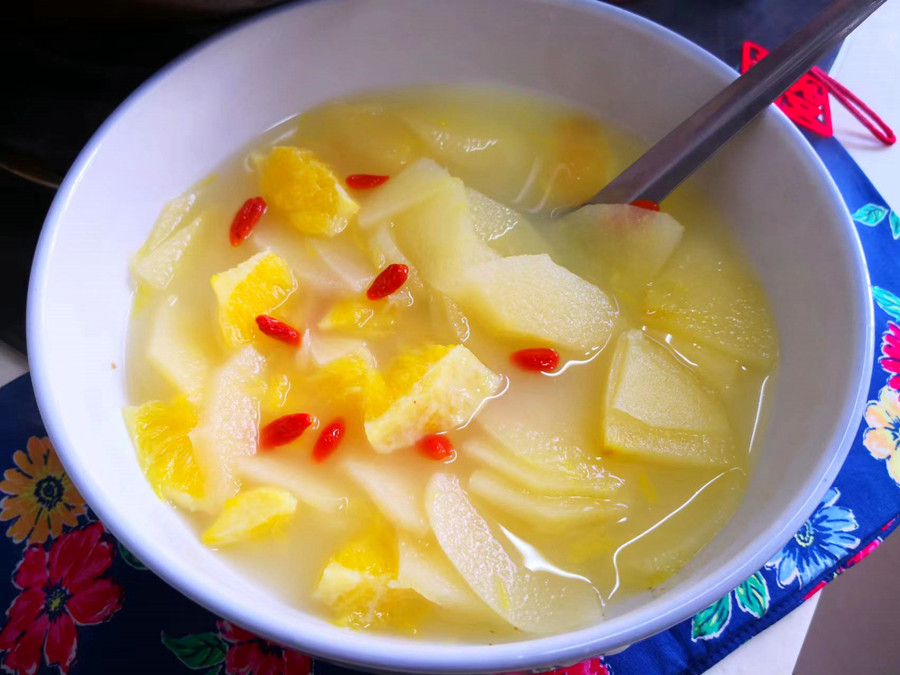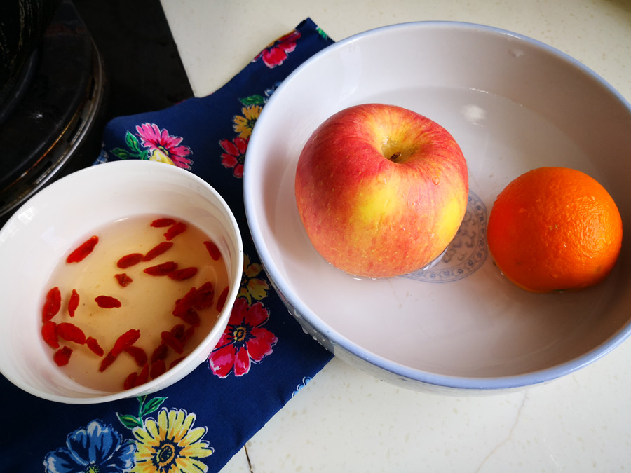 3.锅开后继续煮5分钟左右,捞出苹果皮和橙子皮不要,再放入切好的苹果片,继续煮大约煮5~6分钟后,放入切好的橙子块,继续煮3分钟后放入一把泡软的枸杞,搅拌均匀后就可以关火了,将其倒入大碗中,趁热连汁带果肉一起吃,清爽开胃又滋润,吃完身上暖暖的,嗓子也会舒服很多。