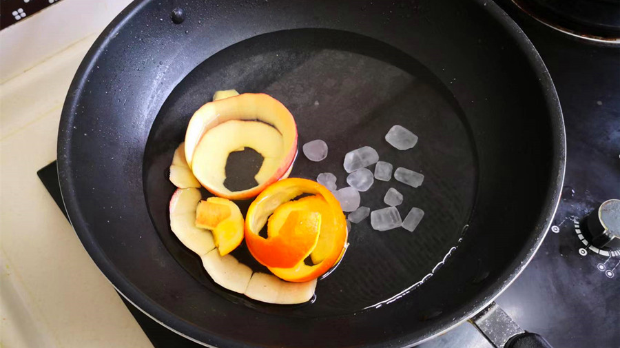 2.削下来的果皮也不要扔了,起锅加入适量的清水,然后放入苹果皮和橙子皮,苹果皮比果肉中含有更多的类黄酮、果胶、花青素和酚类营养物质,橙子皮也是十分的有营养,所以不要浪费了,接着放入适量的冰糖,量根据自己的喜好加,不喜欢甜的可以少加一点,然后盖上锅盖开始煮。