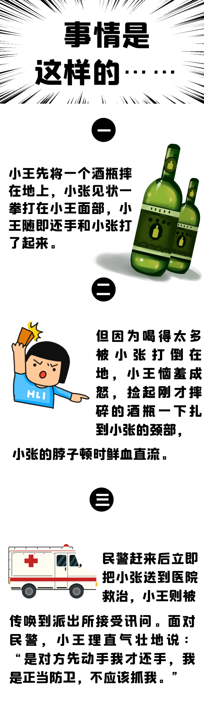 上述案例中,小王的行为明显不构成正当防卫。因为对方殴打的行为不属于明显的暴力行为,且未严重危及生命安全,其主观上也不是为制止对方。小王本人先挑衅摔酒瓶,对案件的发生也有过错。两人的行为应属于互相殴斗。因此,两人都要承担相应的法律后果。