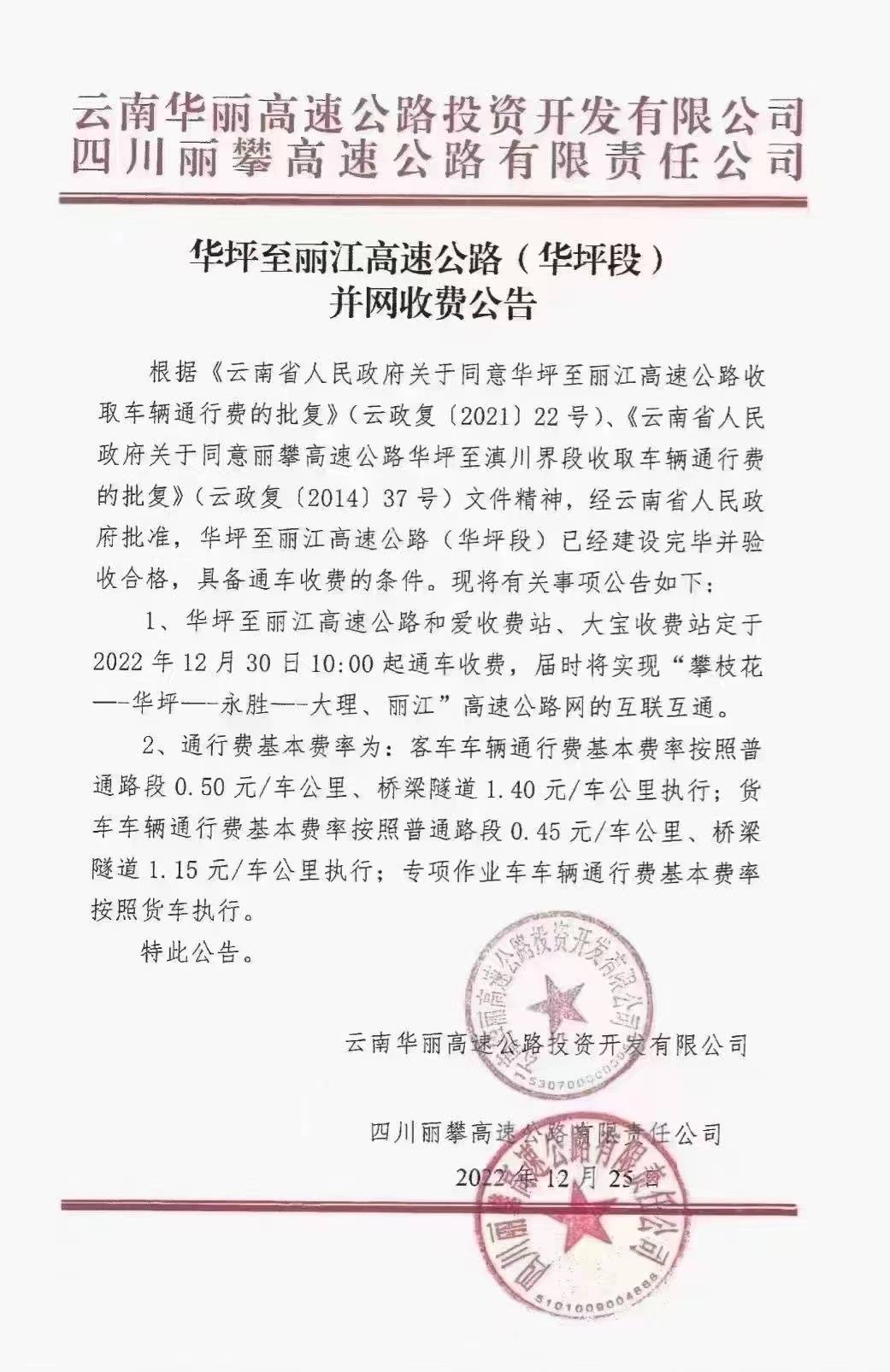 《华坪至丽江高速公路(华坪段)并网收费公告》
