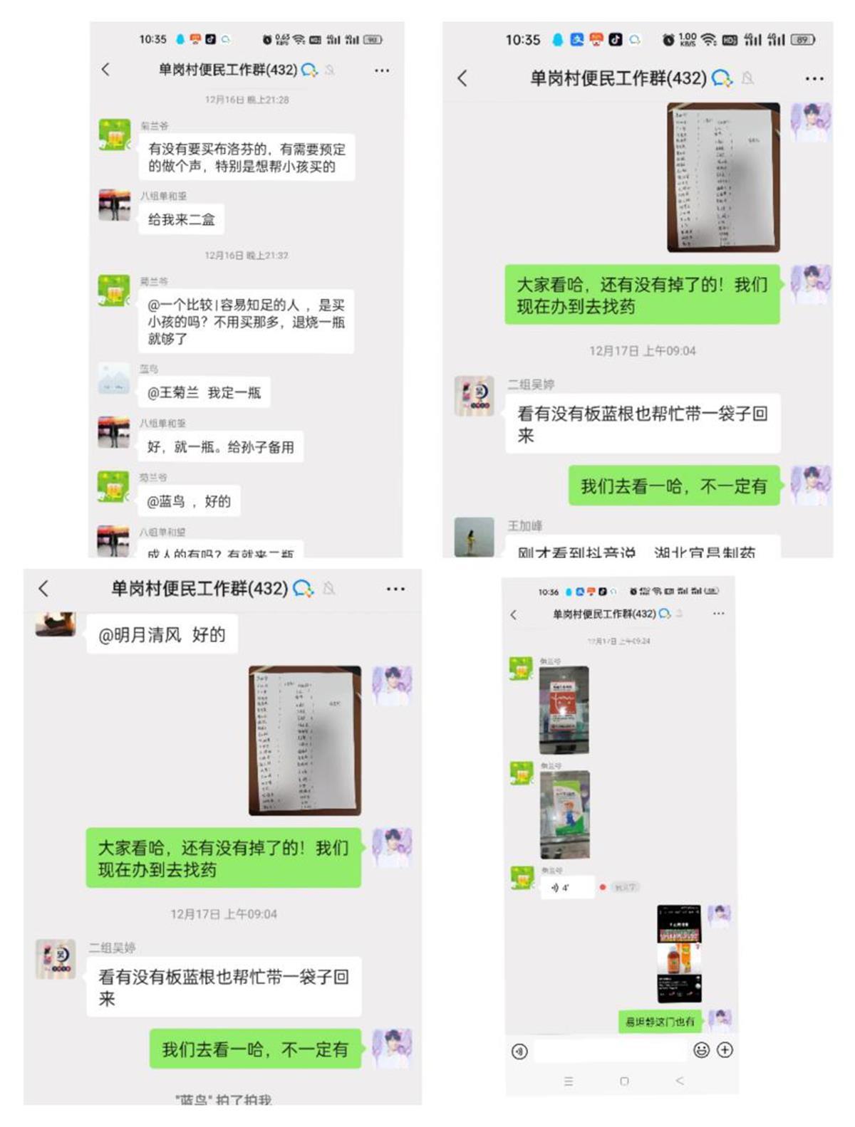 单岗村党支部书记万伟文介绍,辖区内感染者在短时间内明显增加,很多村民家中无药可用,特别是儿童、独居老人等特殊人群。单岗村委会通过微信群搭建药物代购平台,倡导村湾、左邻右舍之间进行无接触式药物共享,解决群众紧急用药难题。