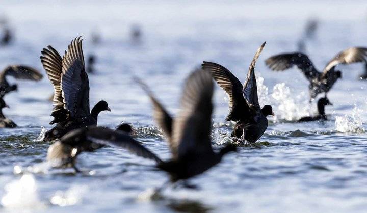 12月24日,大批候鸟在沂河临沂市郯城县马头段水域游弋飞舞。