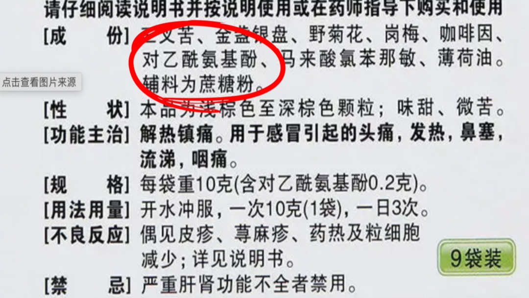 其次,有一些所谓的中成药,比如三九感冒灵,实际上含有西药成分,比如它有对乙酰氨基酚、扑尔敏。这个时候如果我们同时吃了对乙酰氨基酚,就会带来重复用药的问题。尤其对肝功能不全的病人会加剧肝损,所以不建议这样搭配用药,一定要看它药品成分。有西药成分的中药是要非常警惕的,不建议和其他的西药合并使用。