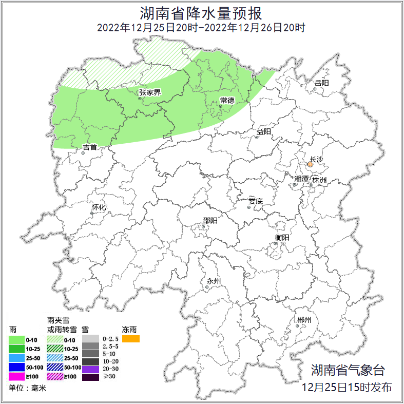 25日20时至26日20时,湘西州北部、张家界、常德北部、怀化北部多云转阴天有小雨或雨夹雪,其他地区多云;北风3~4级;最高气温湘北6~8℃,湘南14~16℃,其他地区11~13℃;最低气温湘南6~8℃,其他地区3~5℃。