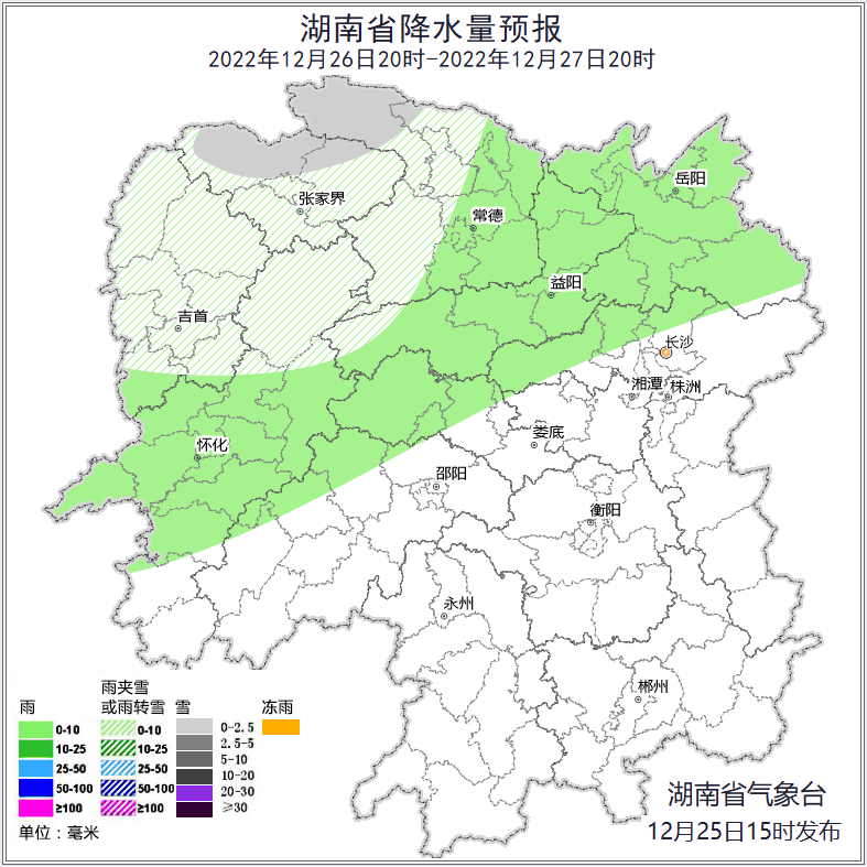 27日20时至28日20时,湘中、湘北阴天有雨夹雪或雪,其中常德南部、湘西州南部、怀化中北部、益阳西部、娄底西部部分中雪,局地大到暴雪,其他地区多云转阴天有小雨;北风4~5级;最高气温湘西、湘北4~6℃,湘南8~10℃,其他地区2~4℃;最低气温湘南2~4℃,其他地区0~2℃。