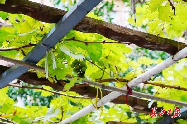 用水管、铁条搭成的葡萄架上结了葡萄。 记者秦璟 摄