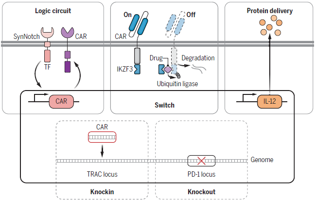 基因组工程也可用于增强细胞疗法安全性和有效性。遗传学上破坏免疫细胞的PD-1等基因会增强其对抗肿瘤的能力,免疫细胞敲除筛选鉴定出了RASA2,Dhx37等基因,其敲除促进T细胞维持及抗癌活性。对基因组已知位点的靶向整合和应用CRISPR-Cas等基因编辑酶能高效地保证长时间作用,前者主要的限制是靶向整合需要与插入位点匹配的序列模板,目前多用腺相关病毒(AAV)递送,但AAV十分昂贵且不易生产,CRISPR-Cas方法的问题则在于其脱靶效应及潜在风险。