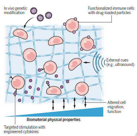 治疗策略需要追求效率和安全性的平衡,研究者们或通过药理学操纵来控制转移免疫细胞的活性,或同时递送活化因子来控制ICTs,工程化的T细胞还能被疫苗特异性地活化,胞外囊泡、脂质体颗粒等也在被研究。生物材料的一大好处就是能够直接在体内操纵免疫细胞,使其协同作用,增强宿主免疫。改造后的抗原呈递细胞(APCs)利用生物材料支架,在原位积累了大量的APCs,使其持续释放抗原,刺激其迁移至引流淋巴结,活化佐剂。体外培养改造后的细胞昂贵又复杂,T细胞及其他免疫细胞的体内转化对于疗法长期的成功使用非常必要。编码CAR的逆转录病毒颗粒与免疫细胞整合,在体内就可以产生CAR T细胞,绕过了体外细胞操作步骤,此外,慢病毒和聚合纳米颗粒也被开发用于特异地靶向T细胞。