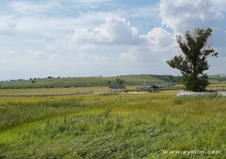 练兵台山顶平坦如砥,站在山丘顶端放目四野,草原广阔无垠,让人顿觉心胸宽阔。从高处向下看,宽阔的绿草地上,零零散散的白榆低头站在那里,每棵树俨然都象一位害羞的姑娘,见到生人羞怯的低下了头。微风吹过,绿草微动,草原上泛起层层绿波。白榆在风中舞动,像姑娘在甩动被风吹乱的秀发。