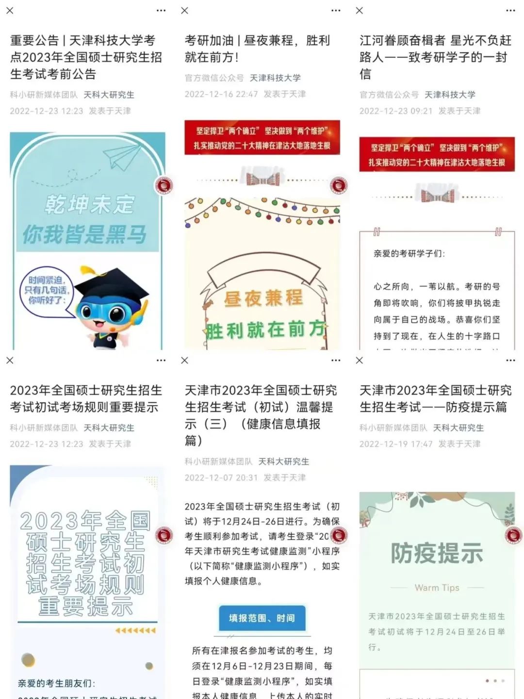 为帮助考研学子提振信心,做好考试冲刺,学校为考生撰写了《江河眷顾奋楫者 星光不负赶路人——致考研学子的一封信》, 精心策划多期考研推文送给考生,为同学们加油鼓劲。学校各单位全力以赴,共同为平安研考、健康研考、诚信研考护航。研究生院负责整体考务组织协调,提前发布多期研考温馨提示,细致提醒每一位考生考试注意事项;学工部统筹做好考生返津返校信息的摸排与跟踪,加强对考生的考风考纪教育工作;教务部门保障两校区考场标准化设备和视频监控系统的正常运转保障;安全工作部负责试卷保管与试卷安全保卫,对考点周边及保密室巡逻,排查安全隐患;后勤管理处、基建处等部门开展教室设施设备排查,包括桌椅、窗帘、照明、钟表等,对检查发现的问题进行了汇总报修和跟进,确保所有考场教室设施均能正常使用 ,提前对考场和周边环境进行消毒、通风,将考场杂物等物品彻底清理,桌面彻底清洁,为考生营造良好的考试环境。
