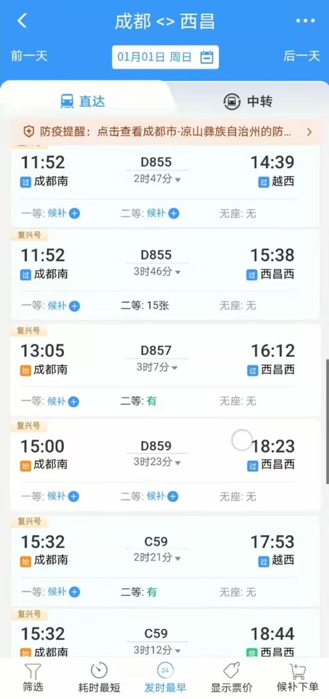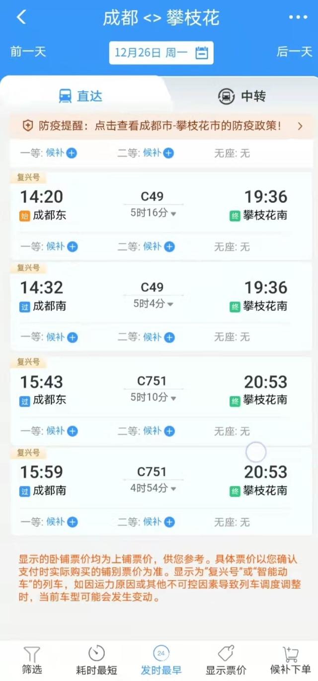 据成都旅行社协会执行会长陈鸿介绍,随着12月26日新成昆铁路开通运营,这个元旦假期,坐着动车去攀西地区旅游也会成为很多人的选择。记者通过查询12306了解到,新成昆铁路开通首日,成都前往西昌、攀枝花的各趟动车各席别车票几乎售罄;元旦假期中,12月31日和1月1日,部分车次的二等座目前还有余票。