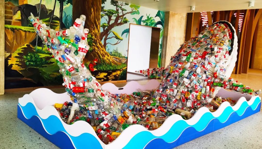 除上述核心科普主题内容外,基地还拓展延伸,打造生态环境大主题的科普研学设施。科普研学楼一楼,隔空3D互动投影,搭配逼真的背景墙绘,营造迷雾森林幻境,唤醒人们对森林、野生动物的爱护之心;同时,充分应用“废物利用”思维,塑造废旧物品的再生形象,强化人们对地球生物、生态环境的保护意识,及“限塑”行动意识的科普与宣传。