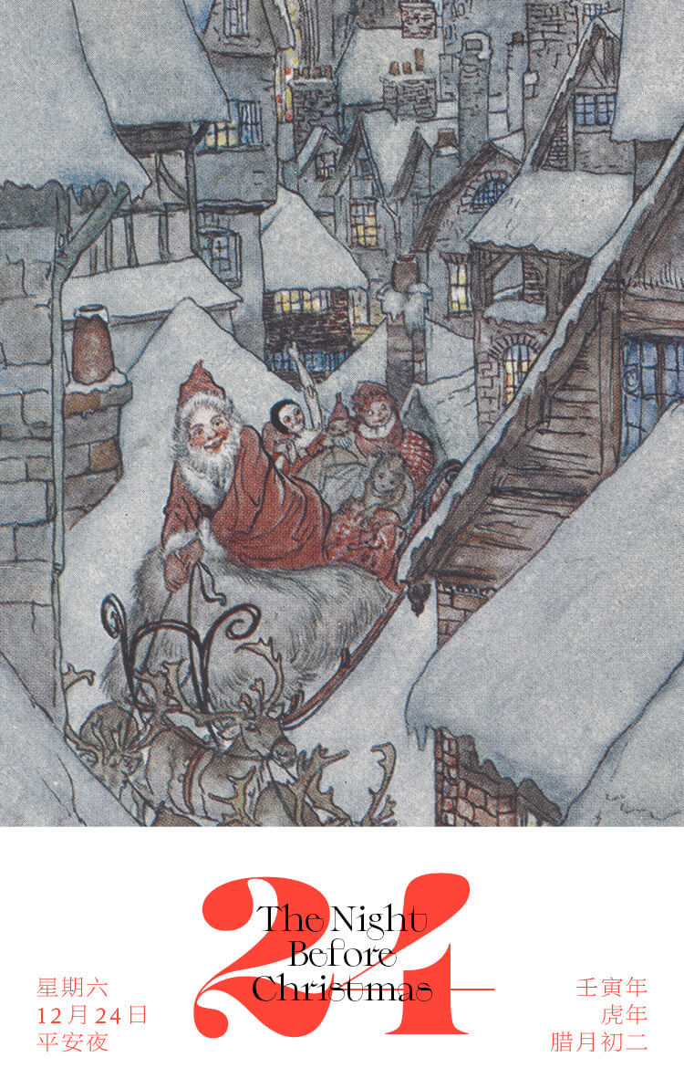 这幅插图是著名插画师亚瑟·拉克姆为圣诞诗歌《圣诞节前的夜晚》绘制的插图。这个故事被称为“美国人写过的最著名的诗句”,作者是美国诗人克莱门特·克拉克·摩尔。