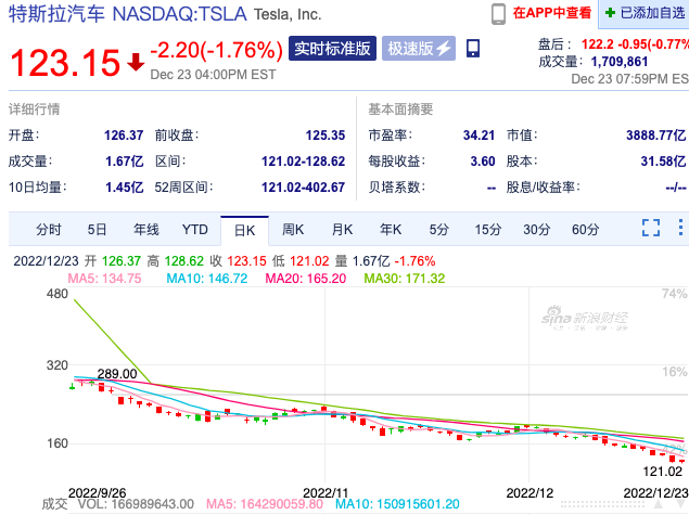 值得注意的是,特斯拉(TSLA,股价123.15美元,3888.77亿美元)股价在过去3个月呈现出了“跌跌不休”的态势。对比来看,今年年初,特斯拉市值一度达到1.2万亿美元,是世界上市值最高的公司之一,特斯拉CEO马斯克也顺利坐上全球首富宝座。