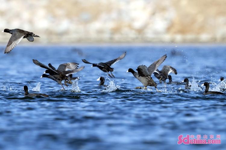 一群白骨顶鸡在沂河山东省临沂市郯城县马头段水域飞舞嬉戏
