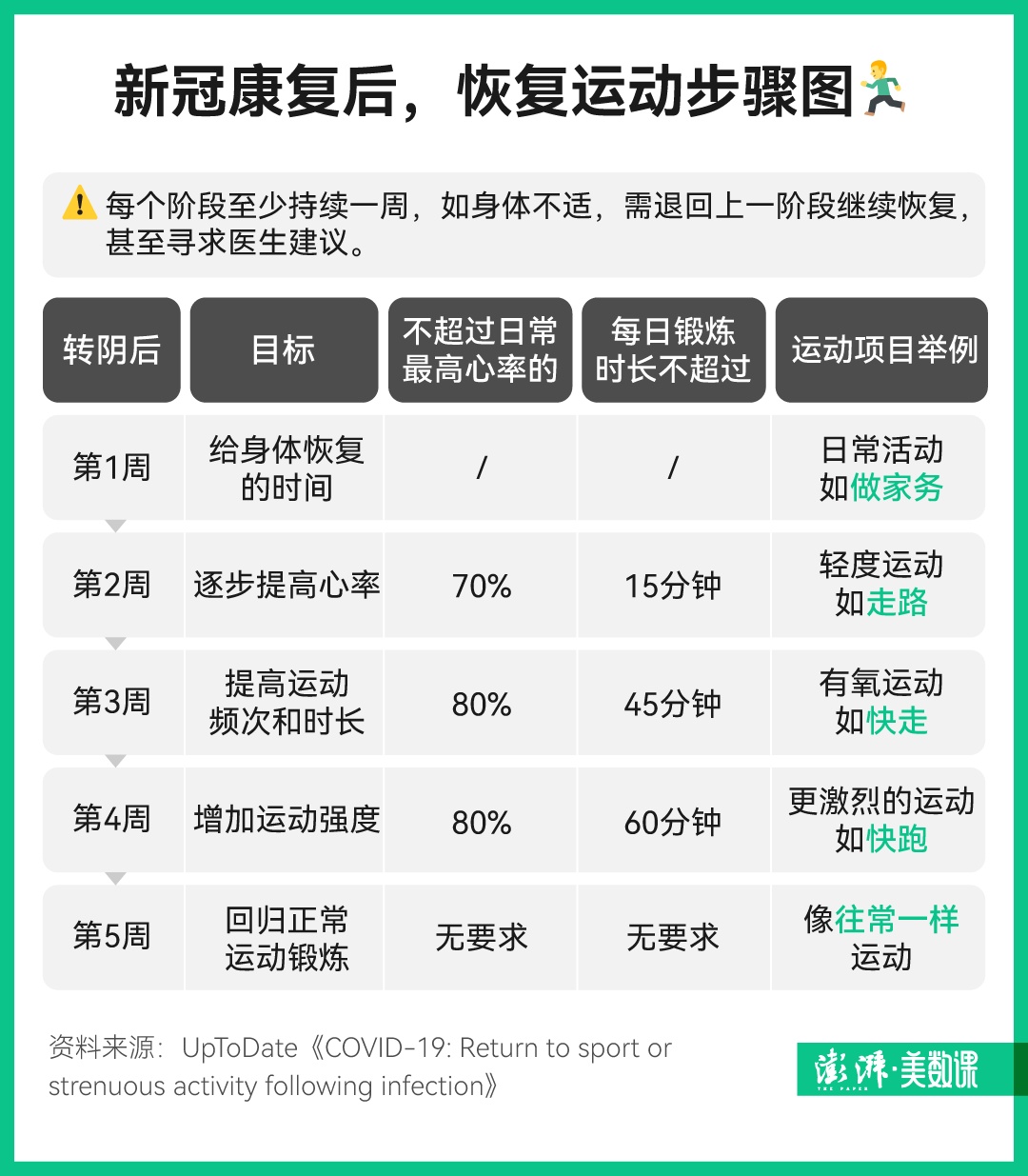 然后再花 7 天时间结合低强度运动,比如去散散步。在身体无任何不适的情况下,在下一周再将运动强度提高一个档次。等转阴一个月后,期间无任何不适后,再考虑将运动强度恢复到感染前的强度。