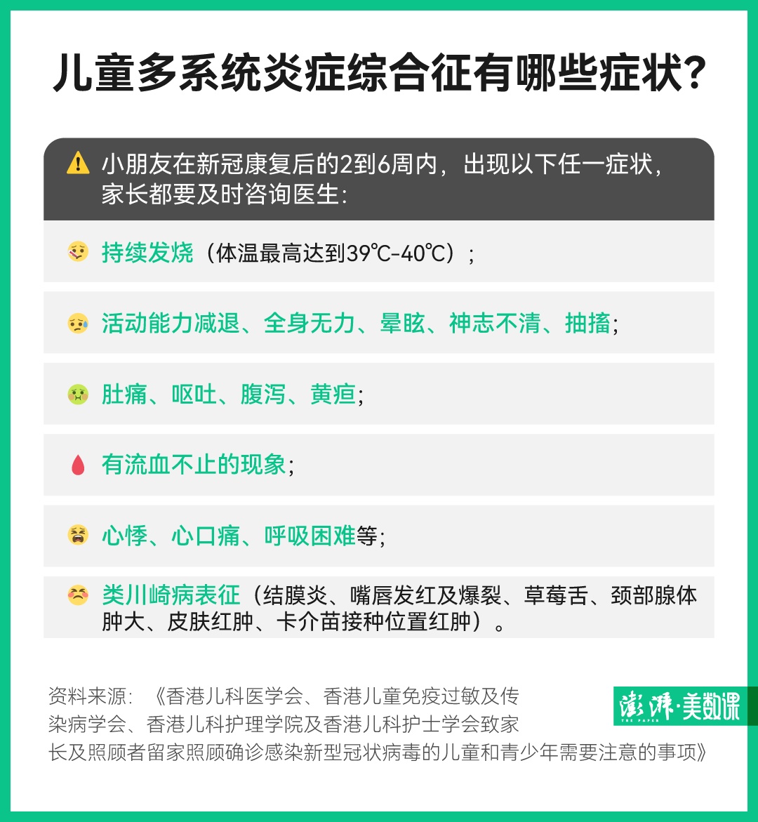 尽管大多数患有 MIS-C 的儿童在经过医治后都会康复,但根据国外的情况看,还是有一些儿童的状况会迅速恶化,以致危及生命。所以需要家长在孩子感染新冠后的 2 个月内,尤其注意这些情况: