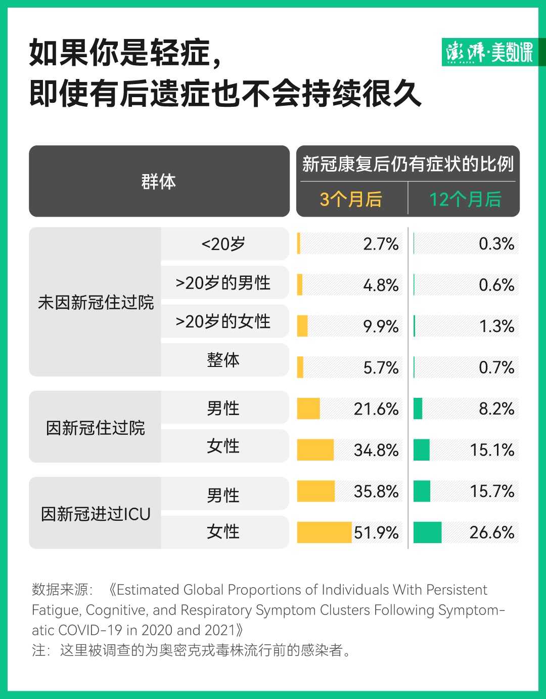 2022 年 10 月,世界卫生组织牵头完成了目前全球最大规模的新冠后遗症研究,通过对 120 万新冠确诊患者长达一年多的追踪调查后发现,新冠后遗症的消失速度,其实比早先预计的要乐观得多:在得新冠 12 个月后,仍受长新冠影响的非住院患者仅为 0.7%,而在得新冠 3 个月时,有 5.7% 的人受此影响。