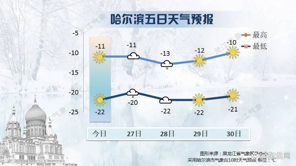 27日白天最高气温:大兴安岭-17~-15°C,哈尔滨、佳木斯、双鸭山、七台河、牡丹江-12~-10°C,鹤岗-10~-8°C,其它地区-14~-12°C。