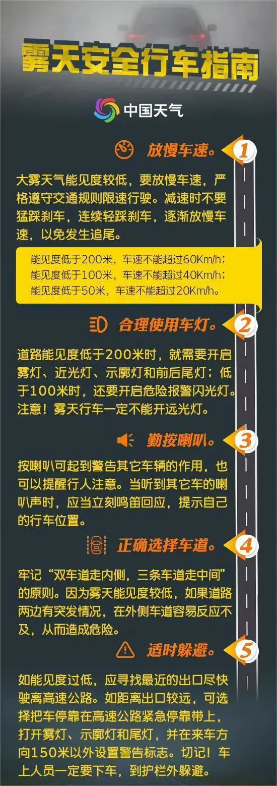 雾中行车时,要严格遵守规定限速行驶,千万不可开快车。雾越大,可视距离越短,车速就需要越低。遇浓雾能见度小于50米时,车速不得超多每小时20公里,此时要从最近的出口尽快驶离高速公路。
